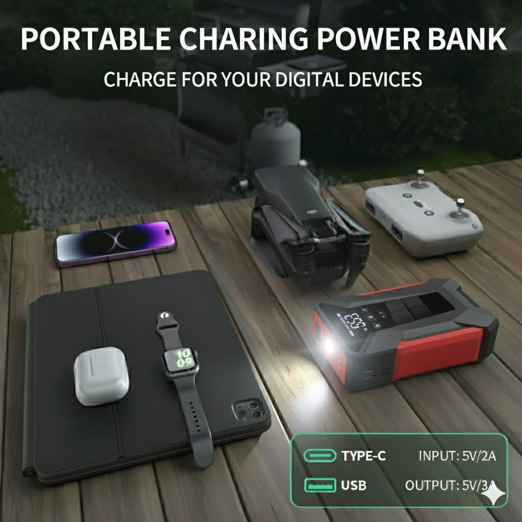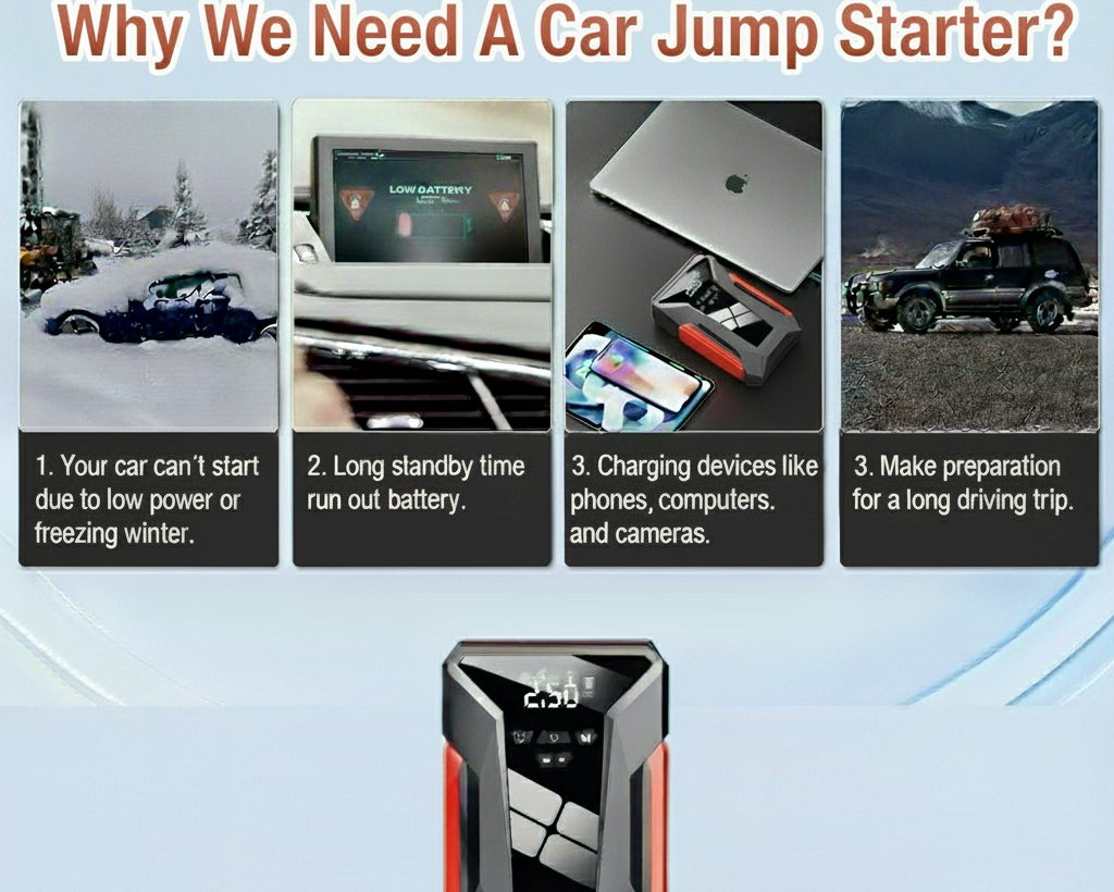 Life happens. Batteries die in the freezing cold and electronics run out of juice on long drives. This single, compact device is your solution. It delivers instant power to your car (even from a "run out battery"), and features USB ports to keep your phones and laptops charged. It's the ultimate preparation for any journey.