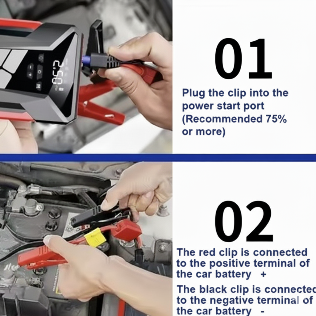 Stop worrying about complex cables. Our jump starter uses smart, safe technology so you only have two simple steps: Plug it in, then clamp the terminals. The built-in protection handles the rest. Safe, simple, and ready when you are.